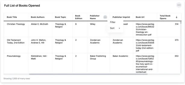 For tables, the sort option allows you to select which column the table is sorted by, while the filter options let you narrow down table results based on any of the columns.
